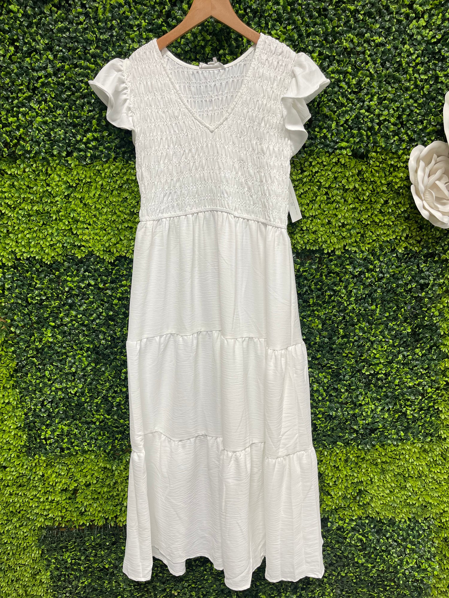 V NECKLINE - FLUTTER MINI SLEEVE - SMOCKED BODICE - TIERED MIDI SKIRT - LINED SKIRT - SHELL: 100% POLYESTER - LINING: 100% POLYESTER