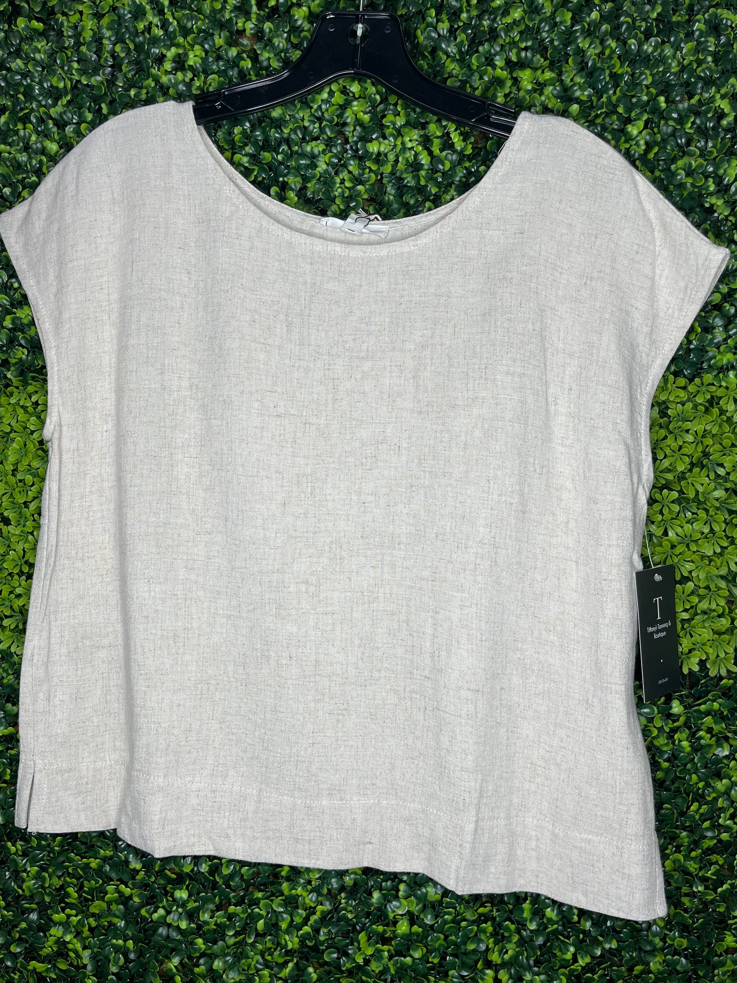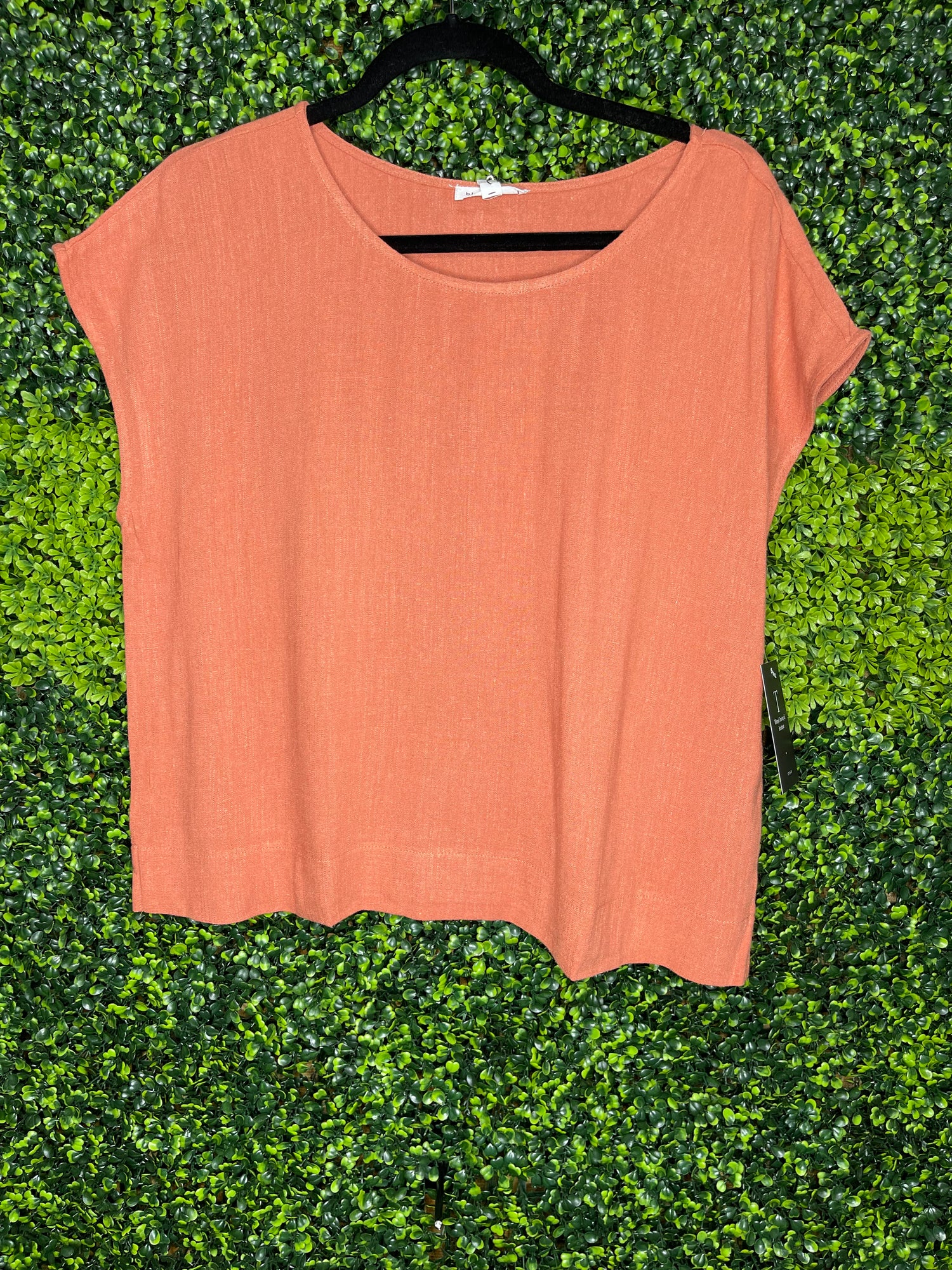 ROUND NECKLINE SHORT SLEEVES EXTENDED SHOULDER BOXY WOVEN TOP SELF: RAYON 80% , LINEN 20