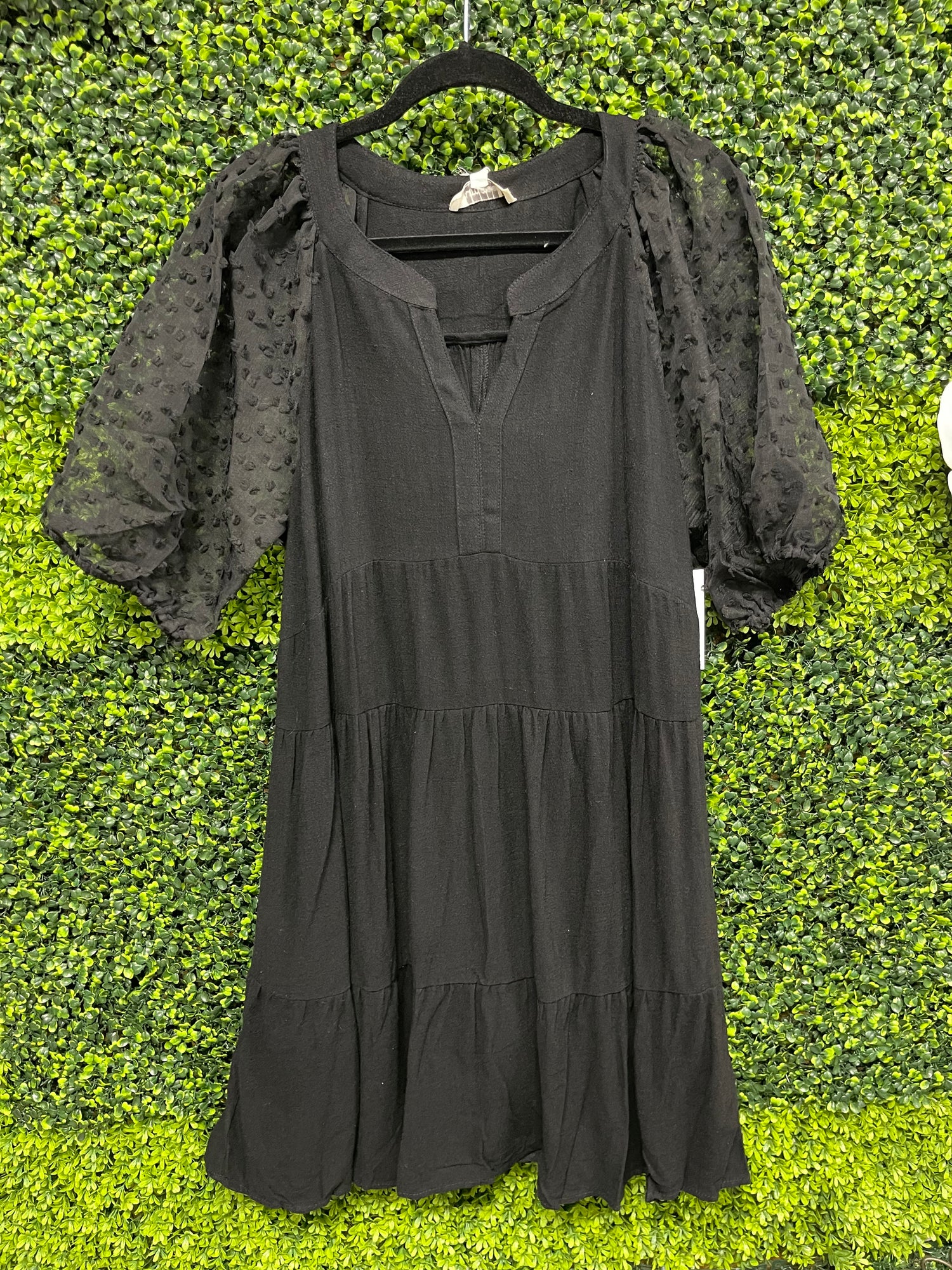 Linen Tierd A-Line Split Neck Dress with Floral Applique Detailed Cuffed Sleeve